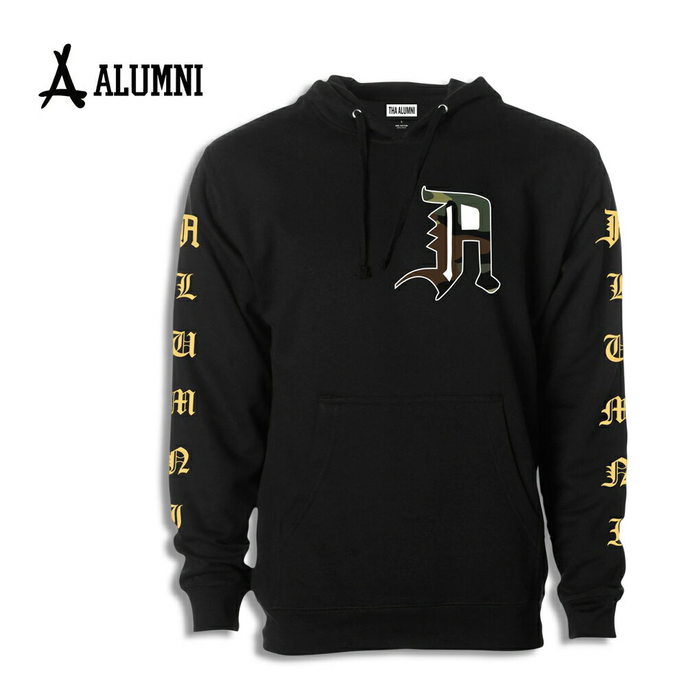 ALUMNI CLOTHING アルムナイクロージング OLD ENGLISH HOODIE BLACK + YELLOW + CAMO メンズ インポート KID INK スウェット パーカー